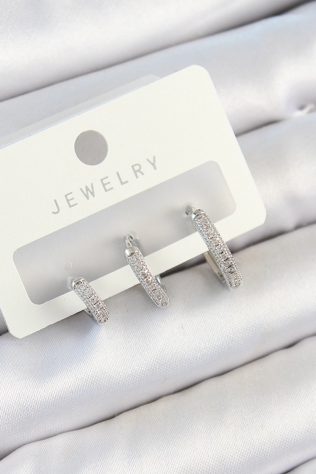 Dodes Dodes Pirinç Zirkon Taşlı Halka Model Gümüş Renk 3'lü Çift Kadın Küpe Set TG27BKP10812