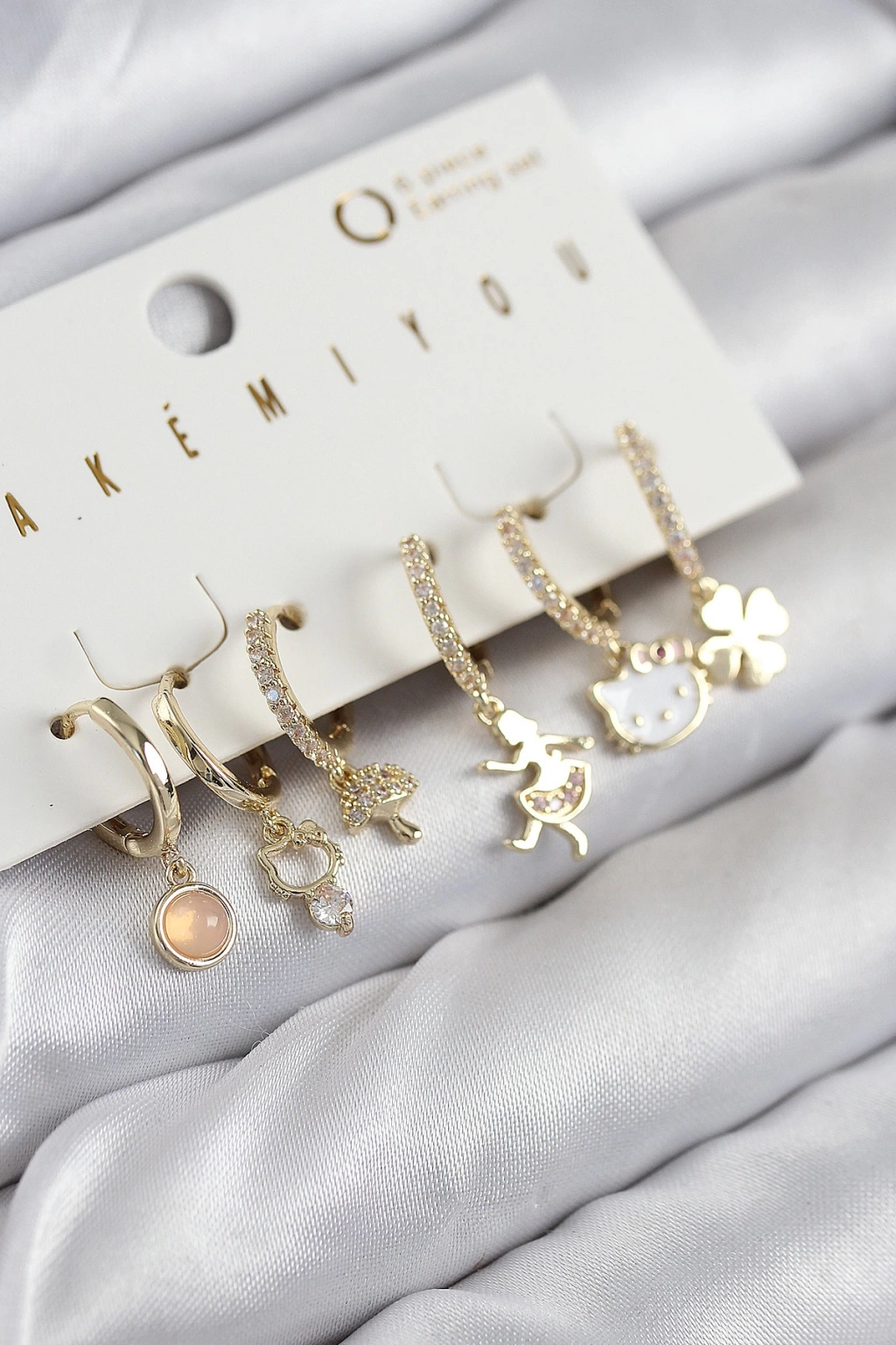 Dodes Dodes Pirinç Zirkon Taşlı Hello Kity Ve Yonca Model Gold Renk 6'lı Küpe Set TG27BKP11206