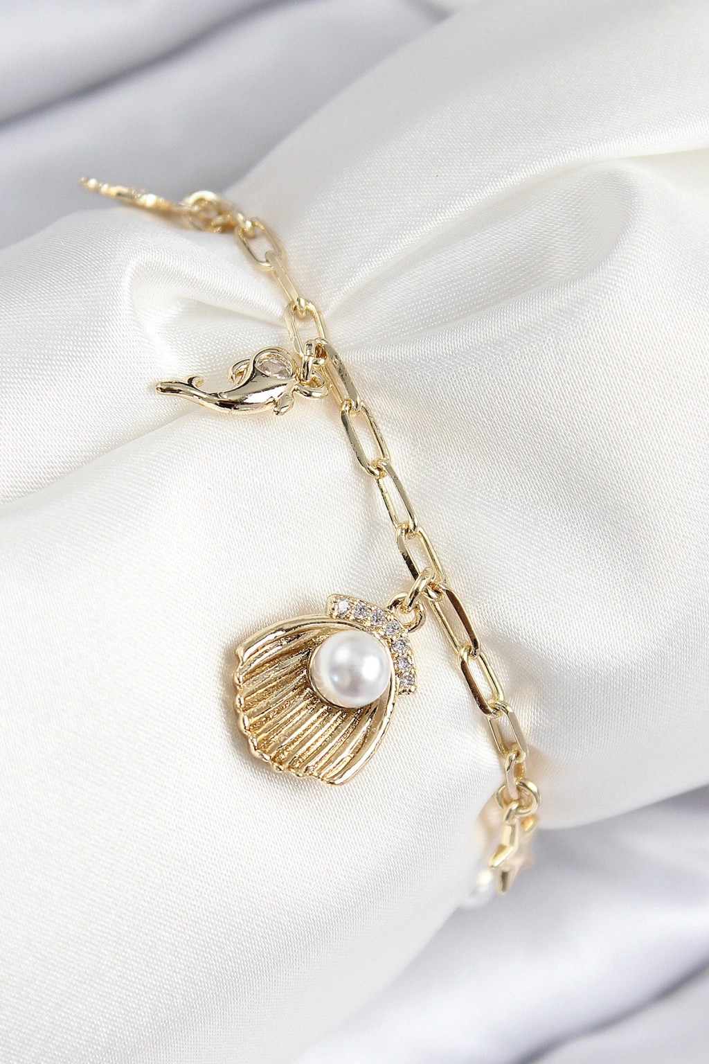 Dodes Dodes Pirinç Zirkon Taşlı İncili İstiridye Model Gold Renk Kadın Bileklik TG27BB7774