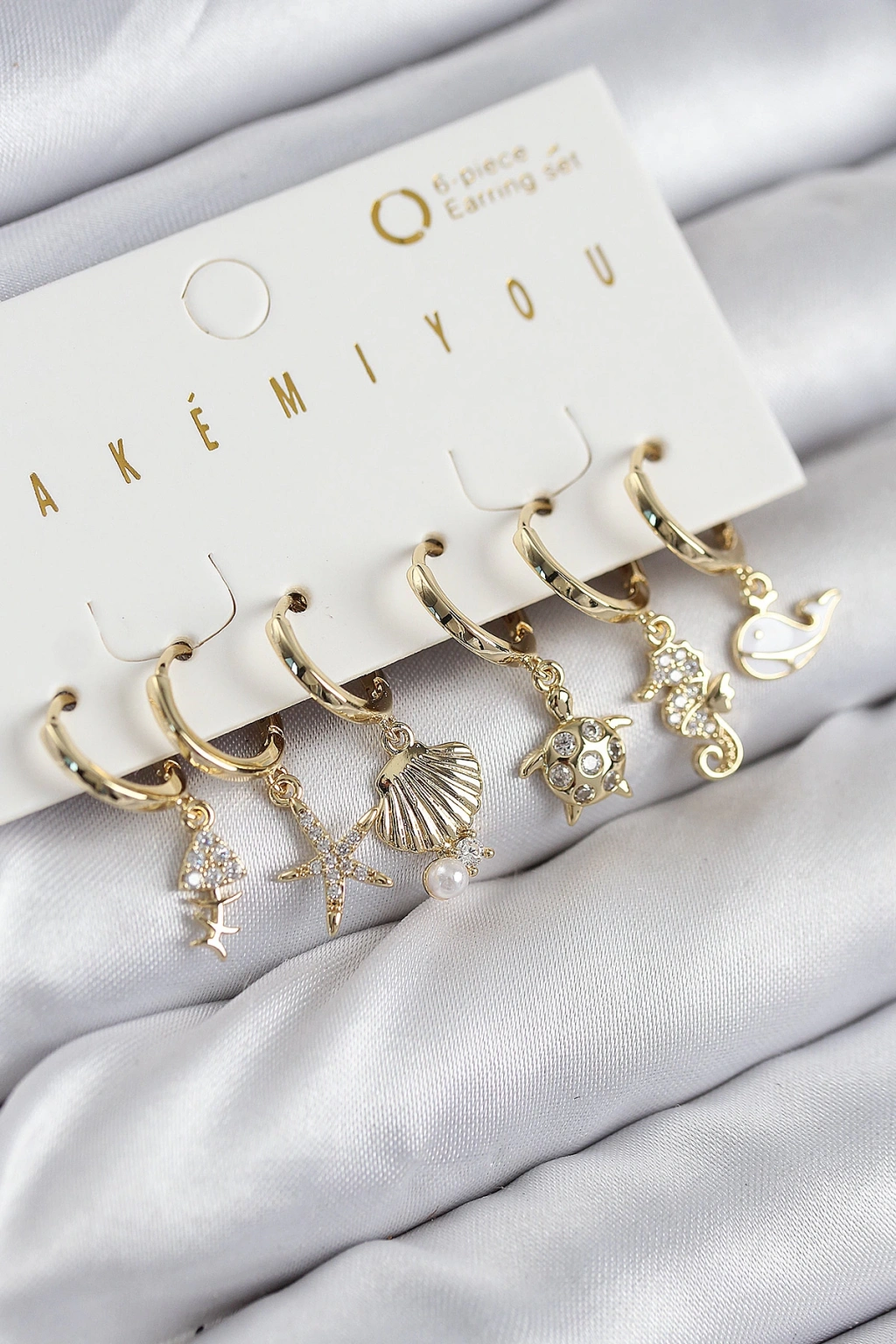 Dodes Dodes Pirinç Zirkon Taşlı İstiridye Balina Ve Yıldız Gold Renk 6'lı Küpe Set TG27BKP11203