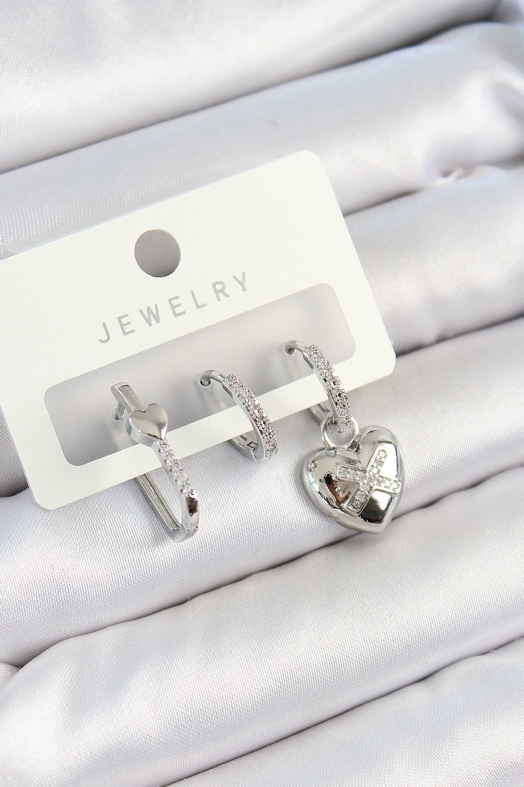 Dodes Dodes Pirinç Zirkon Taşlı Kalp Model Gümüş Renk 3'lü Çift Kadın Küpe Set TG27BKP10801