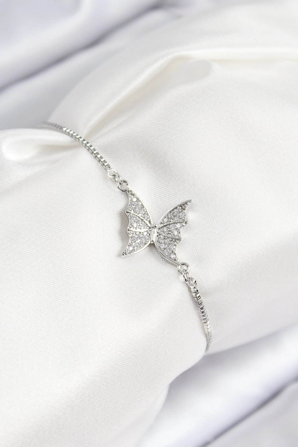 Dodes Dodes Pirinç Zirkon Taşlı Kelebek Model Gümüş Renk Asansörlü Kadın Bileklik TG27BB7724