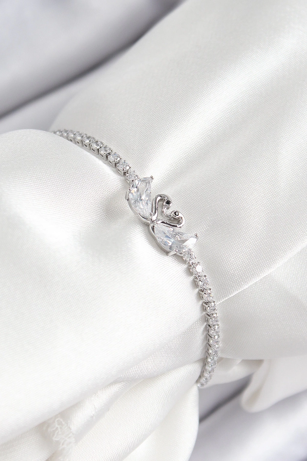 Dodes Dodes Pirinç Zirkon Taşlı Kuğu Model Gümüş Renk Asansörlü Kadın Bileklik TG27BB7463