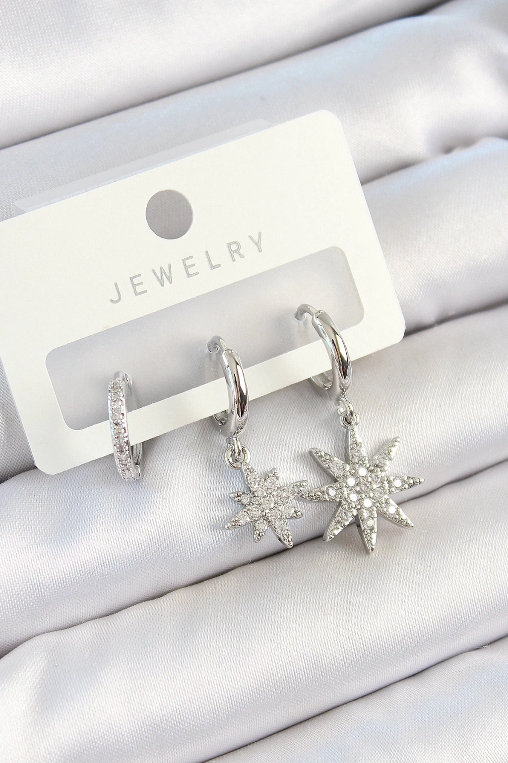 Dodes Dodes Pirinç Zirkon Taşlı Kutup Yıldızı Model Gümüş Renk 3'lü Çift Kadın Küpe Set TG27BKP10807