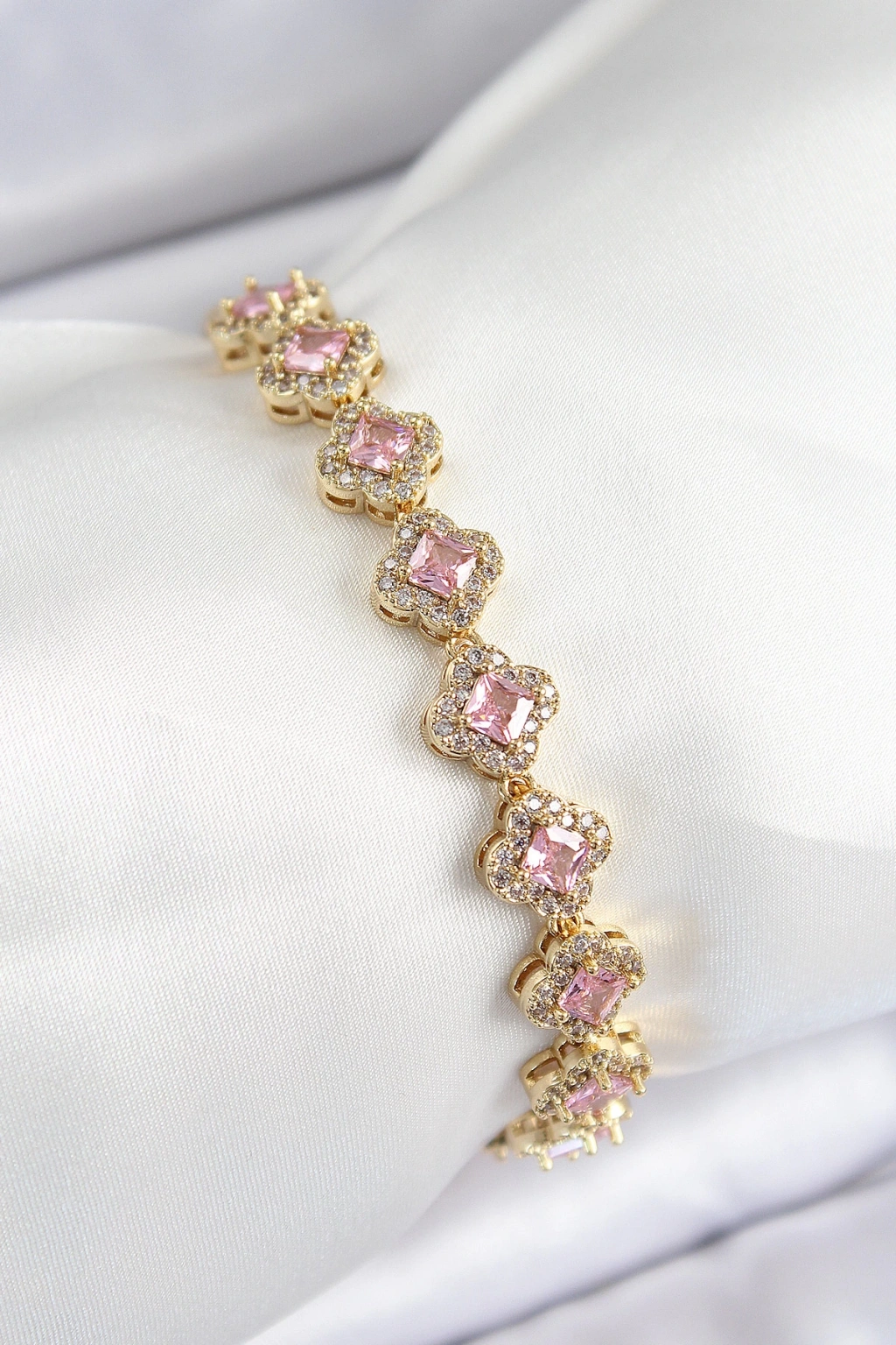 Dodes Dodes Pirinç Zirkon Taşlı Pembe Yonca Baget Model Gold Renk VIP Seri Kadın Bileklik TG27BB7506