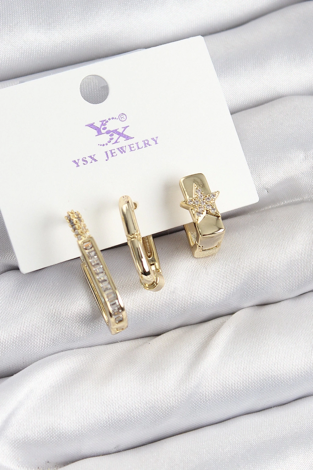 Dodes Dodes Pirinç Zİrkon Taşlı Yıldız Model Gold Renk 3'lü Kadın Küpe TG27BKP10943