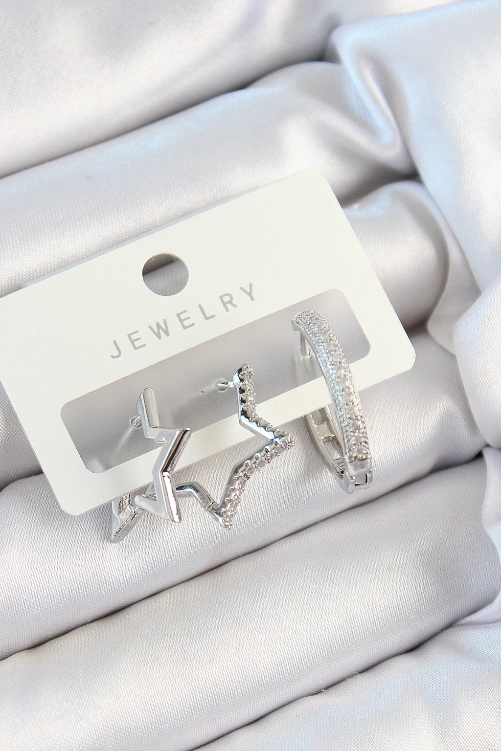 Dodes Dodes Pirinç Zirkon Taşlı Yıldız Ve Halka Model Gümüş Renk 3'lü Çift Kadın Küpe Set TG27BKP10808