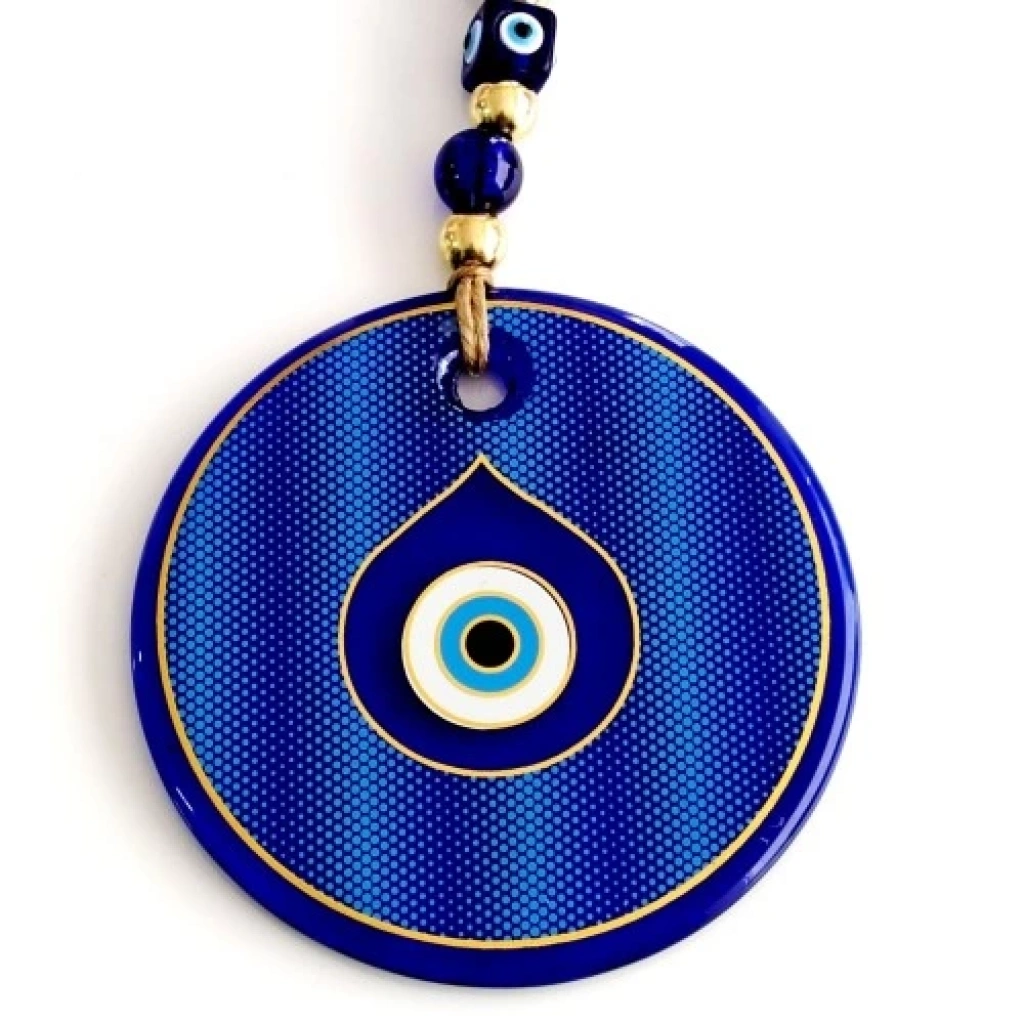 Gold Yaldızlı ürünümüz damla model göz ile süslenmiştir. Ürünümüz birinci kalite cam malzemeden üretilmektedir. Ürünümüzün yuvarlak kısmı 13 santimetre çapındadır. Ürünümüz ip dahil 30 santimetre boyundadır.
