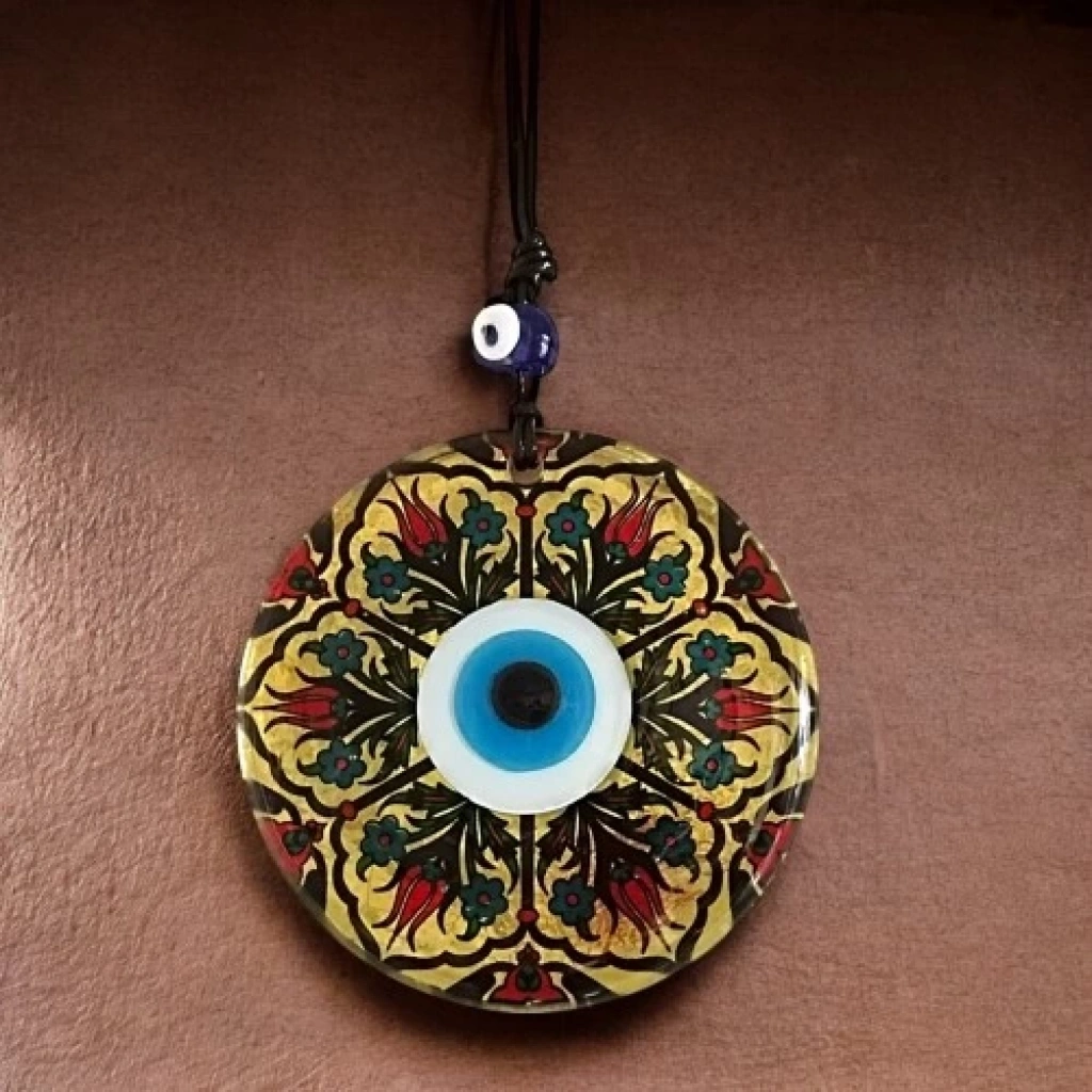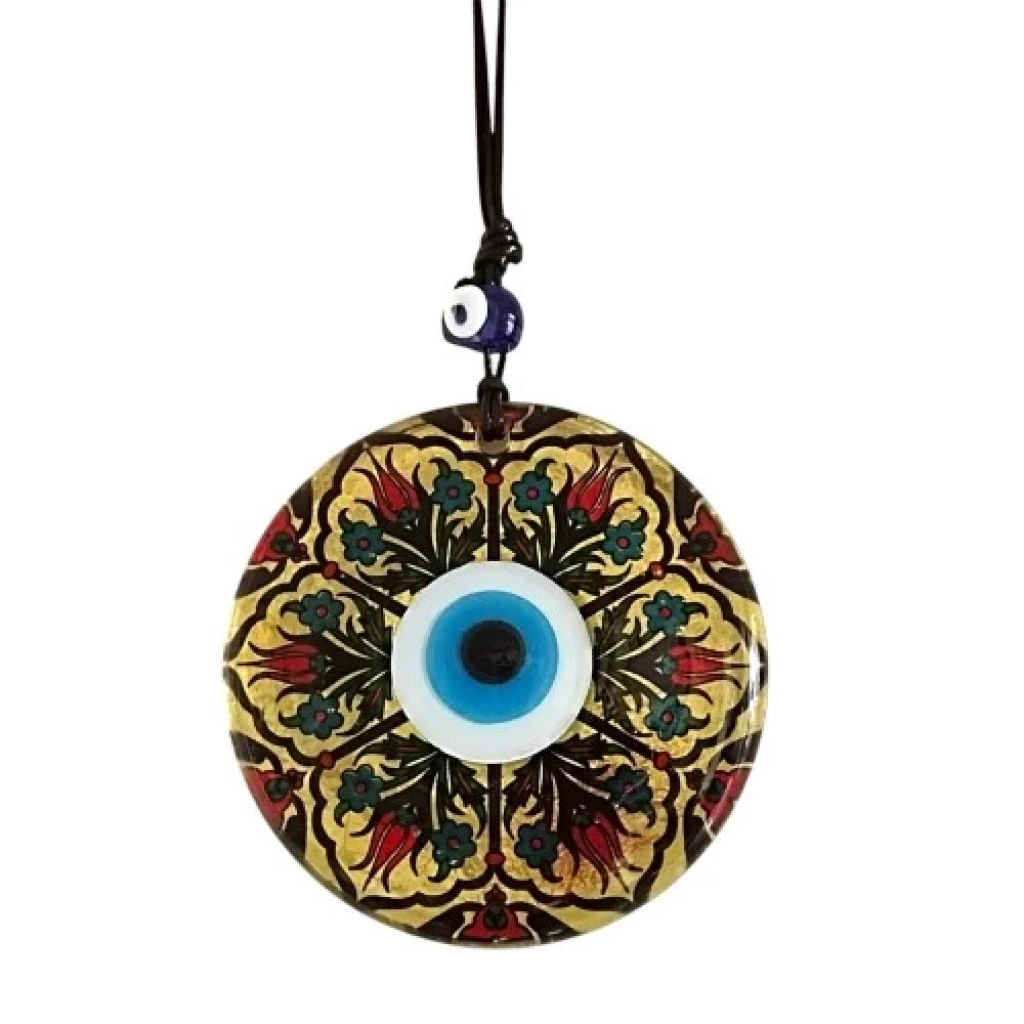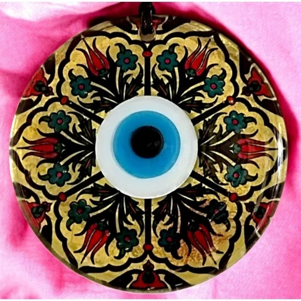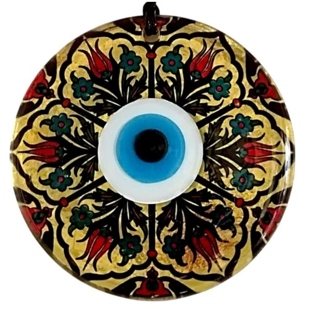 Altın varaklı ve Lale desenli duvar süsümüz el yapımıdır. Nazar boncuklu duvar dekorumuz 12 santimetre Çapındadır. Ürünümüz ip dahil 25 santimetre boyundadır.