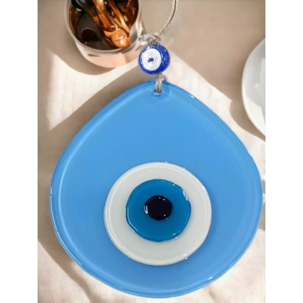 Açık Mavi renk nazar boncuklu duvar süsümüz tamamen el işçiliği ile üretilmiştir. Tasarım harikası el yapımı nazar boncuklu duvar süsümüz 13 x 12 santimetre ölçülerindedir. Ürünümüz ip dahil 21 santimetre boyundadır.