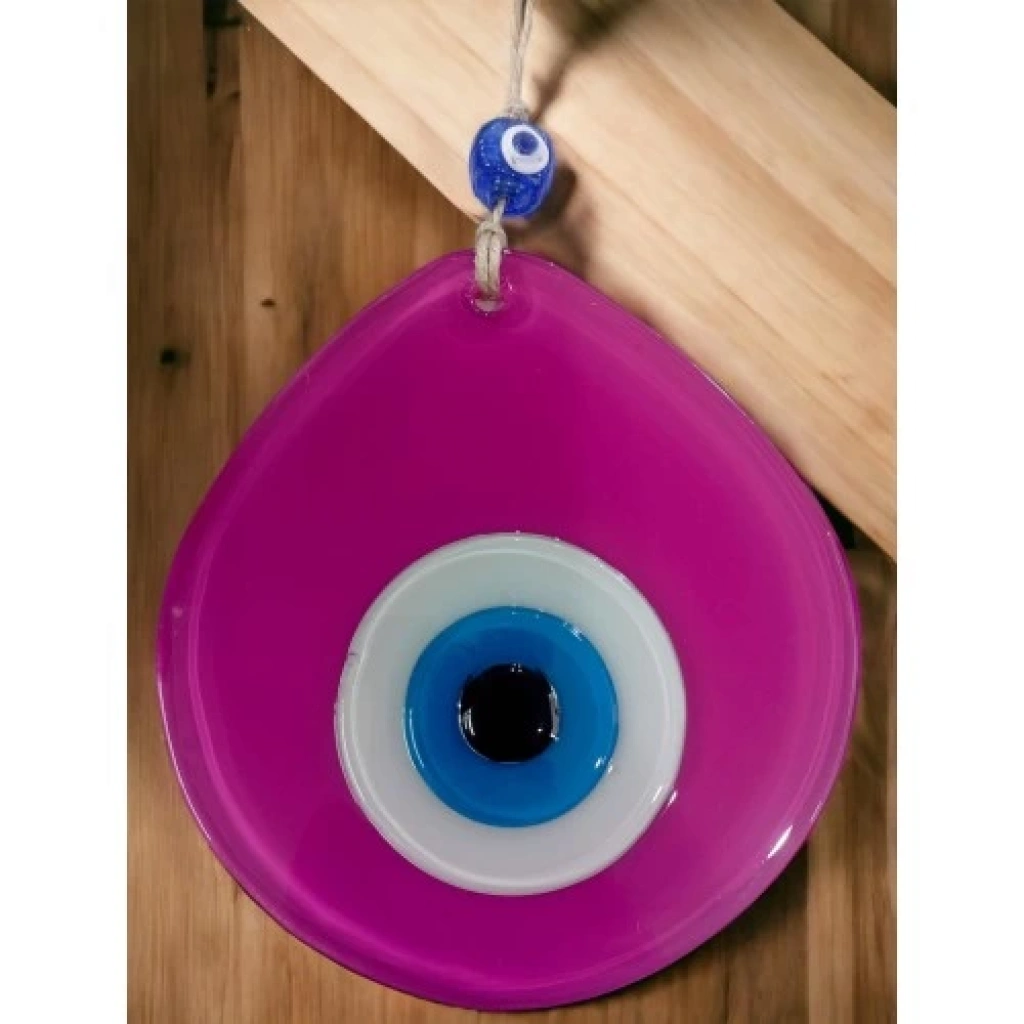 Pembe renk nazar boncuklu duvar süsümüz tamamen el işçiliği ile üretilmiştir. Tasarım harikası el yapımı nazar boncuklu duvar süsümüz 13 x 12 santimetre ölçülerindedir. Ürünümüz ip dahil 21 santimetre boyundadır.