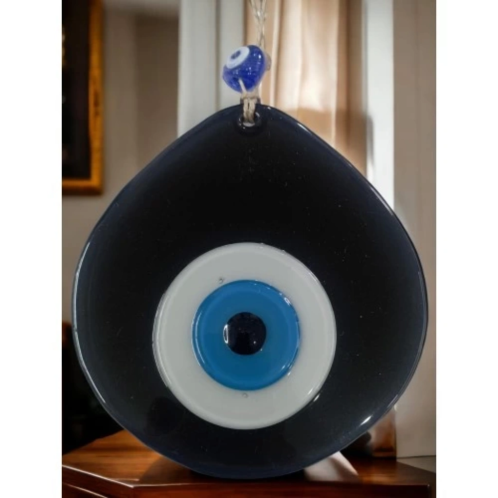 Siyah renk nazar boncuklu duvar süsümüz tamamen el işçiliği ile üretilmiştir. Tasarım harikası el yapımı nazar boncuklu duvar süsümüz 13 x 12 santimetre ölçülerindedir. Ürünümüz ip dahil 21 santimetre boyundadır.