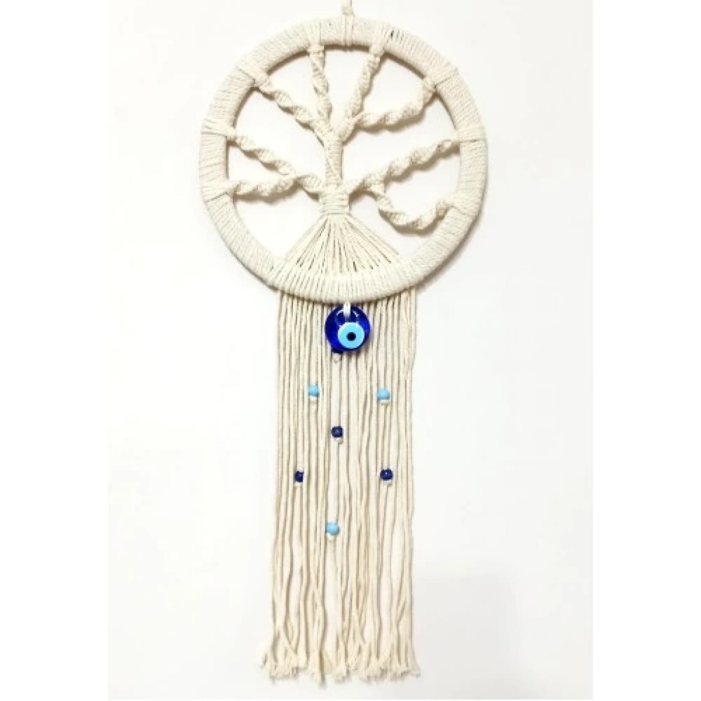 Nazar boncuklu makrome duvar süsümüz hayat ağacı şekillidir. Ürünümüzün yuvarlak kısmı 28 santimetre çapındadır. Duvar süsümüzü ip dahil 70 santimetre boyundadır. Ürünümüz ekru renk olup üzerindeki nazar boncuğu camdır.