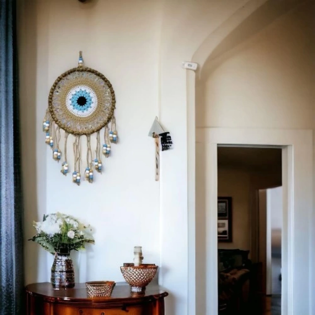 Örgülü Duvar Süsü Capucino Kahvesi Duvar Süsü Boncuklu duvar süsümüz el yapımıdır. Duvar süsümüz 23 santimetre çapında İp dahil 55 cm boyundadır