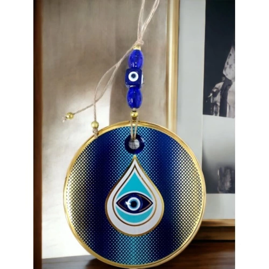 Nazar boncuklu göz duvar süsümüz nazar boncuğu ile süslenmiştir. Ürünümüz mavi cam nazar boncuğundan tamamen el işçiliği ile üretilmiştir. Ürünümüzün yuvarlak kısmı 13 santimetre çapındadır. Duvar süsümüz ip dahil yaklaşık 30 santimetre boyundadır.