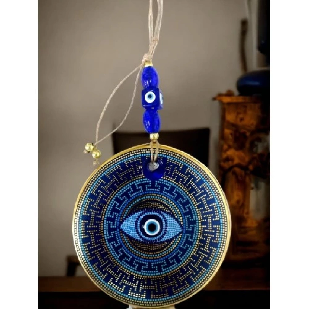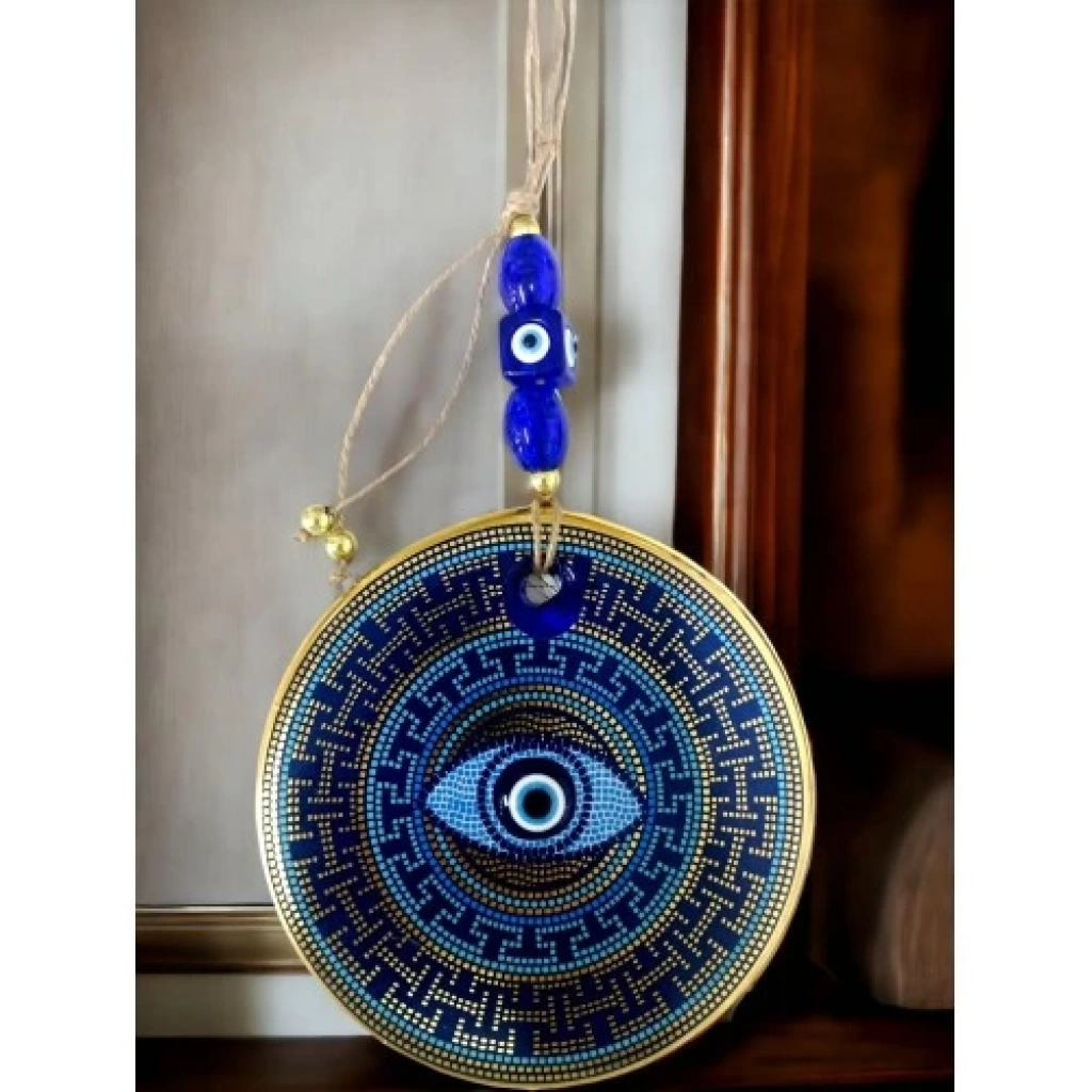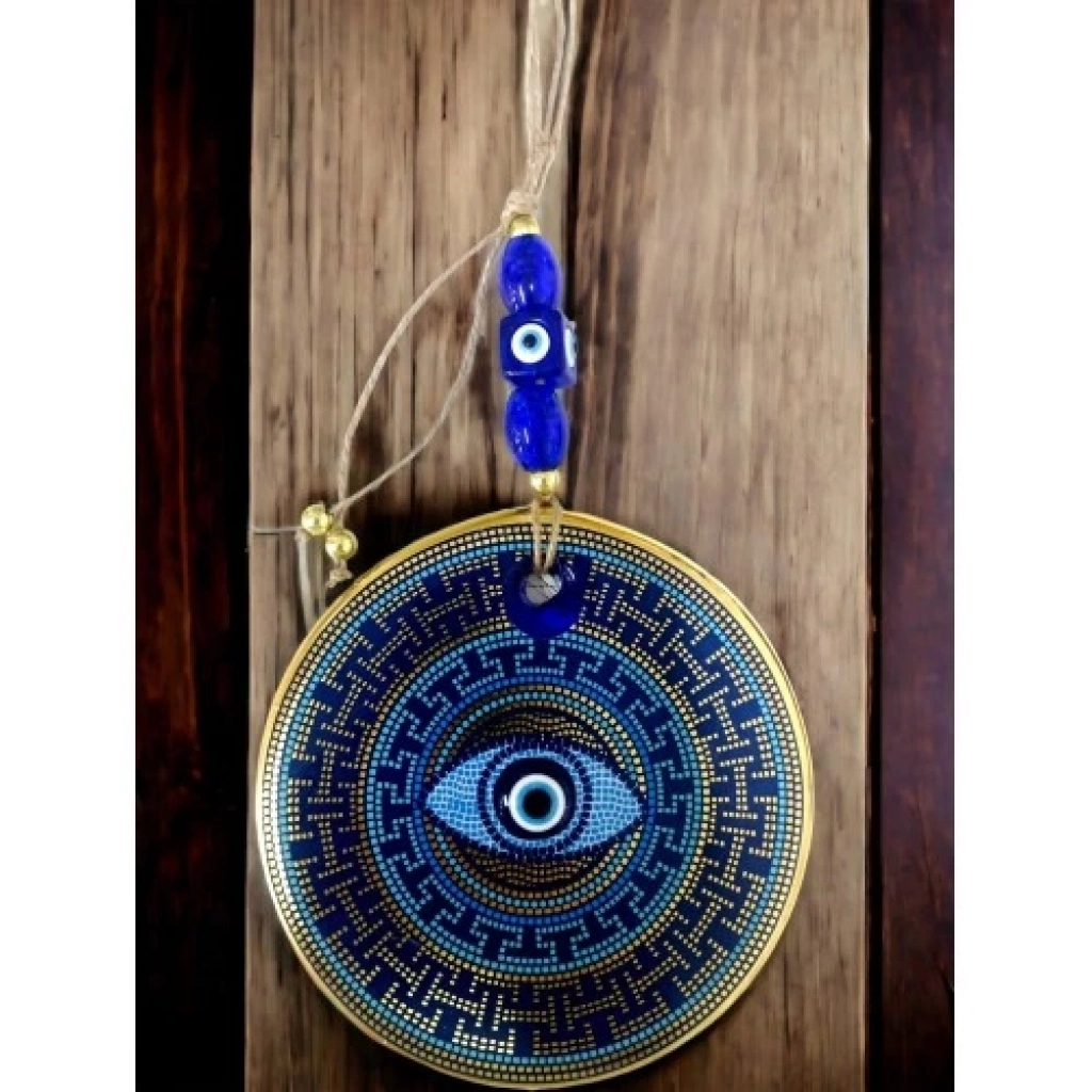 Nazar boncuklu göz duvar süsümüz nazar boncuğu ile süslenmiştir. Ürünümüz mavi cam nazar boncuğundan tamamen el işçiliği ile üretilmiştir. Ürünümüzün yuvarlak kısmı 13 santimetre çapındadır. Duvar süsümüz ip dahil yaklaşık 30 santimetre boyundadır.