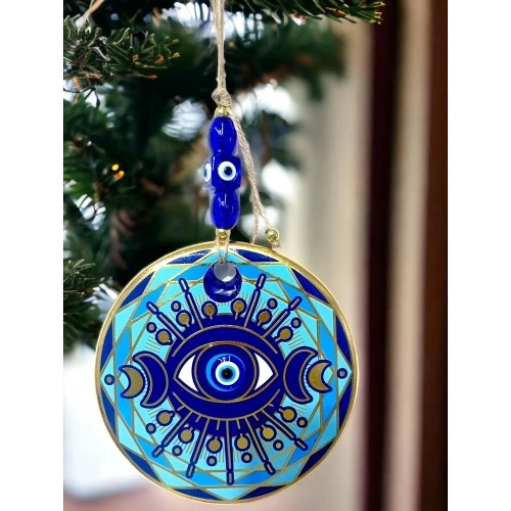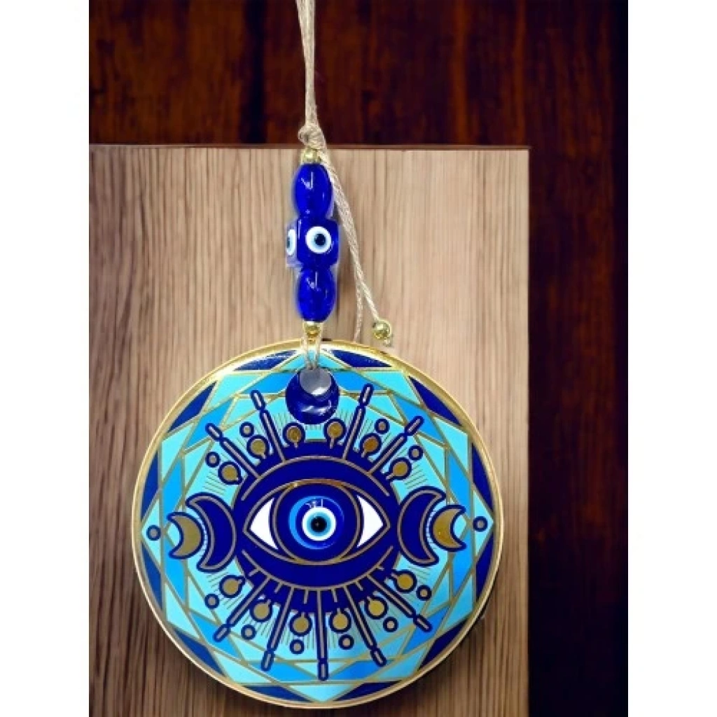Nazar boncuklu göz duvar süsümüz nazar boncuğu ile süslenmiştir. Ürünümüz mavi cam nazar boncuğundan tamamen el işçiliği ile üretilmiştir. Ürünümüzün yuvarlak kısmı 13 santimetre çapındadır. Duvar süsümüz ip dahil yaklaşık 30 santimetre boyundadır.