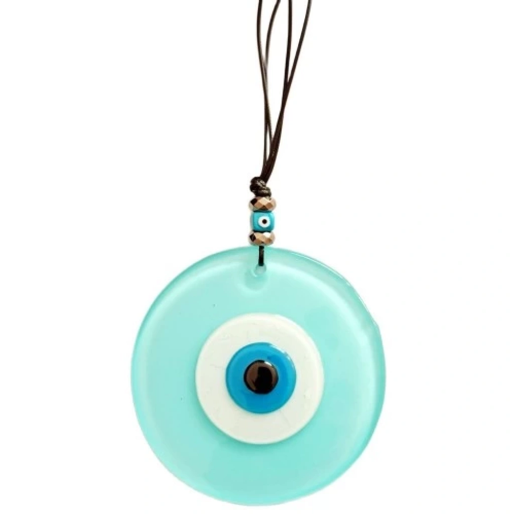 Turkuaz rengi nazar boncuklu duvar süsümüz özel tasarım olarak üretilmiştir. Tamamen el işçiliği ile üretilmiş ürünümüz 12 santimetre çapındadır. Ürünümüz ip dahil 26 santimetre boyundadır. Turkuaz rengin en özel tonlarından üretilmiş duvar süsümüzü ister kendiniz için, isterseniz sevdiklerinize hediye etmek için tercih edebilirsiniz.