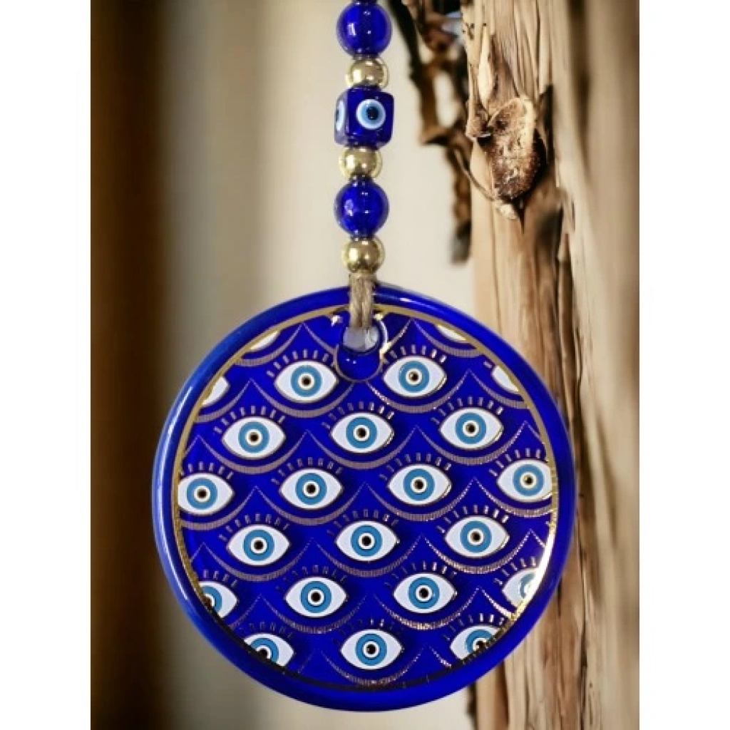Mavi renk yıldız motifli göz süsümüz nazar boncuğu ile süslenmiştir. Ürünümüz mavi cam nazar boncuğundan tamamen el işçiliği ile üretilmiştir. Ürünümüzün yuvarlak kısmı 13 santimetre çapındadır. Duvar süsümüz ip dahil yaklaşık 30 santimetre boyundadır.