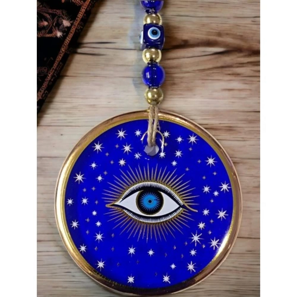 Mavi renk yıldız motifli göz süsümüz nazar boncuğu ile süslenmiştir. Ürünümüz mavi cam nazar boncuğundan tamamen el işçiliği ile üretilmiştir. Ürünümüzün yuvarlak kısmı 13 santimetre çapındadır. Duvar süsümüz ip dahil yaklaşık 30 santimetre boyundadır.
