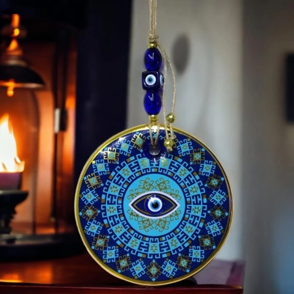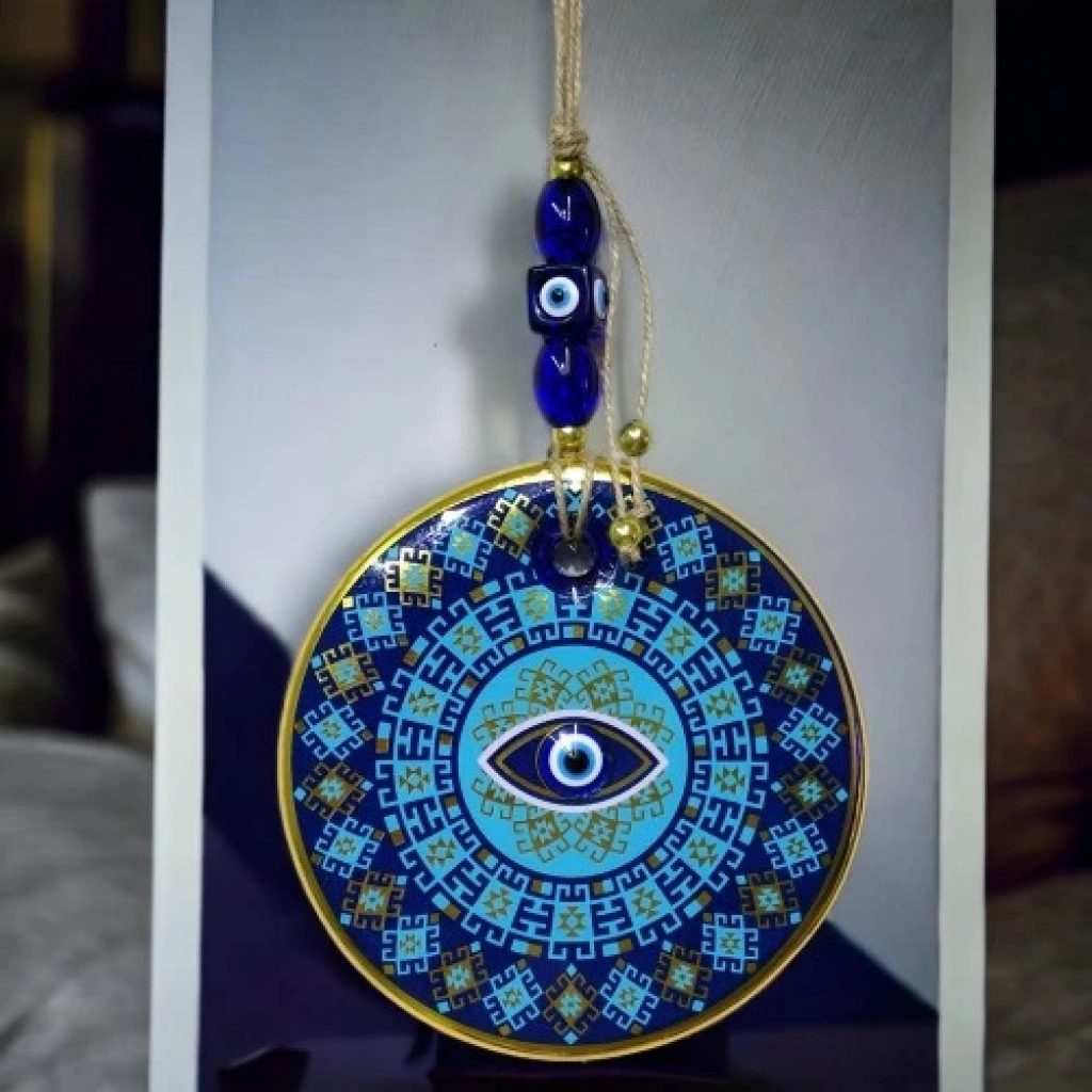 Nazar boncuklu göz duvar süsümüz nazar boncuğu ile süslenmiştir. Ürünümüz mavi cam nazar boncuğundan tamamen el işçiliği ile üretilmiştir. Ürünümüzün yuvarlak kısmı 13 santimetre çapındadır. Duvar süsümüz ip dahil yaklaşık 30 santimetre boyundadır.